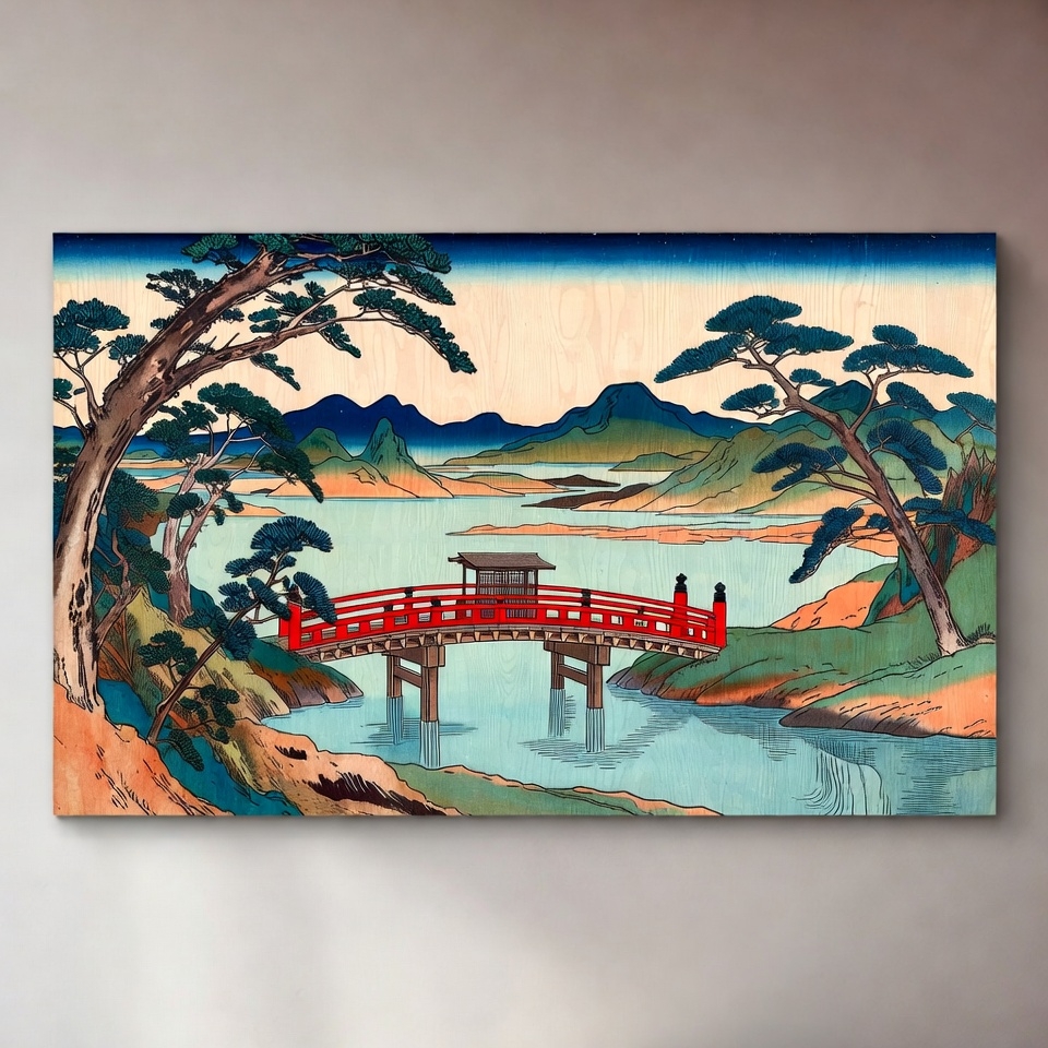 A traditional Japanese woodblock print depicts a striking red bridge with a pagoda-style roof spanning a serene lake. Tall pine trees frame the scene, with distant green mountains and calm blue waters reflecting the surroundings. Two small figures in traditional attire stand on the bridge.
