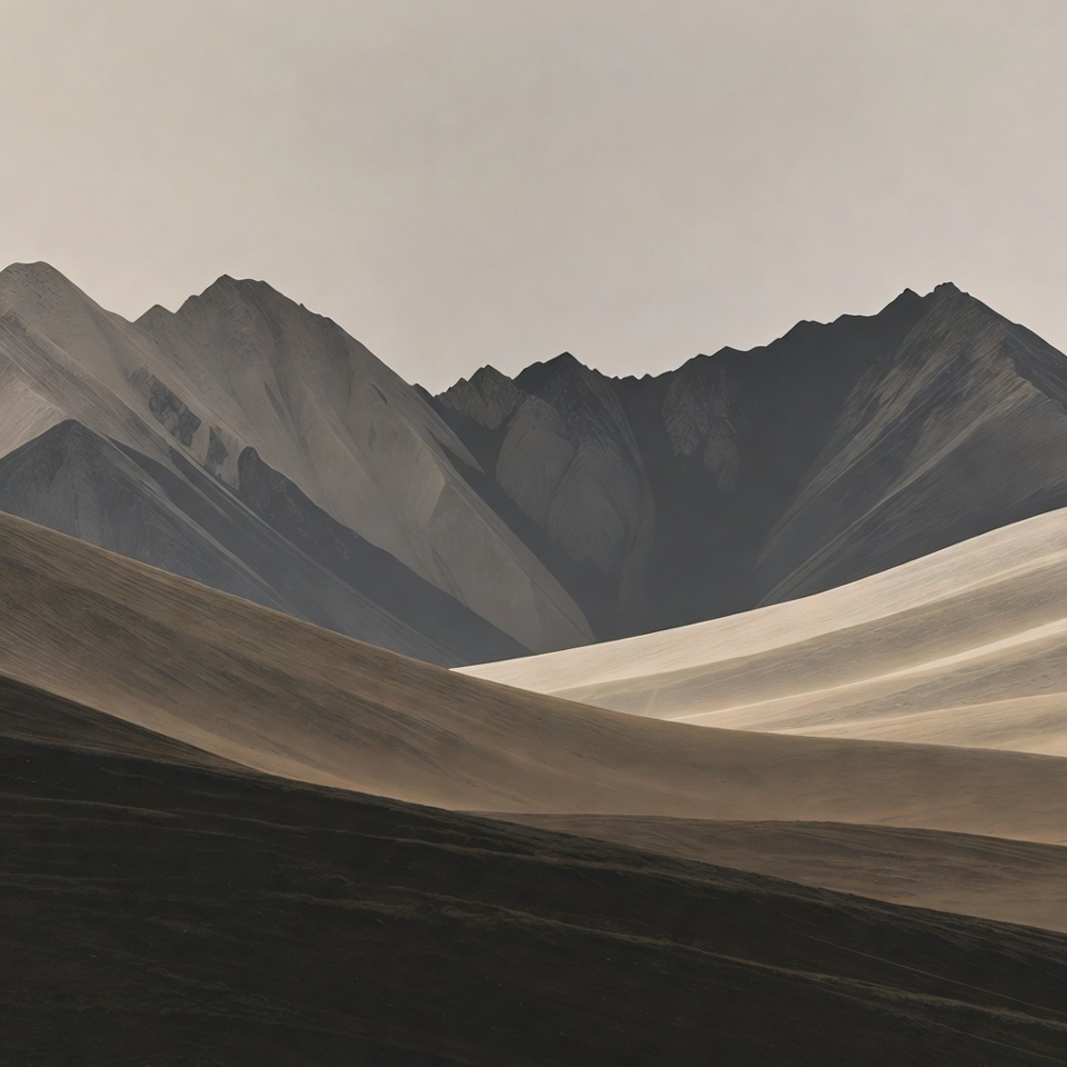 arid terrain, desert landscape, dramatic landscape, dune curves, geological formation, hazy sky, layered dunes, monochrome, mountain range, mountains, natural beauty, nature, outdoor, peaks, ridges, scenery, silhouette mountains, vast desert, wilderness, sand dunes