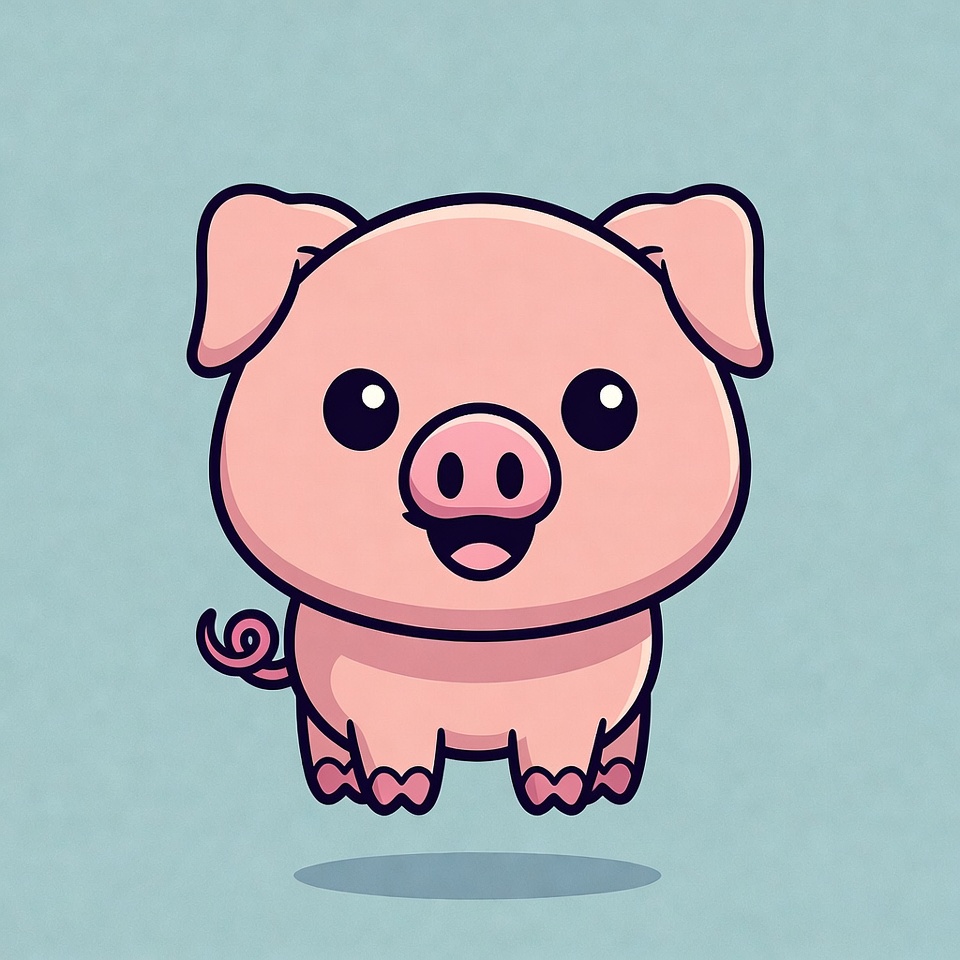 A kawaii-style cartoon pig with pink skin, large sparkling eyes, and a big smile stands on a light blue background. It has small ears, a curly tail, and tiny hooves. The pig appears to be floating slightly above a subtle shadow.