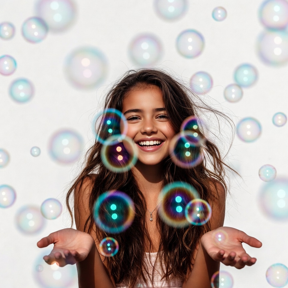 A young girl with long brown hair smiles happily while surrounded by numerous colorful floating bubbles. She wears a white tank top and holds her hands out towards the bubbles on a white background. Her hair flows gently, and the bubbles vary in size and iridescent colors.