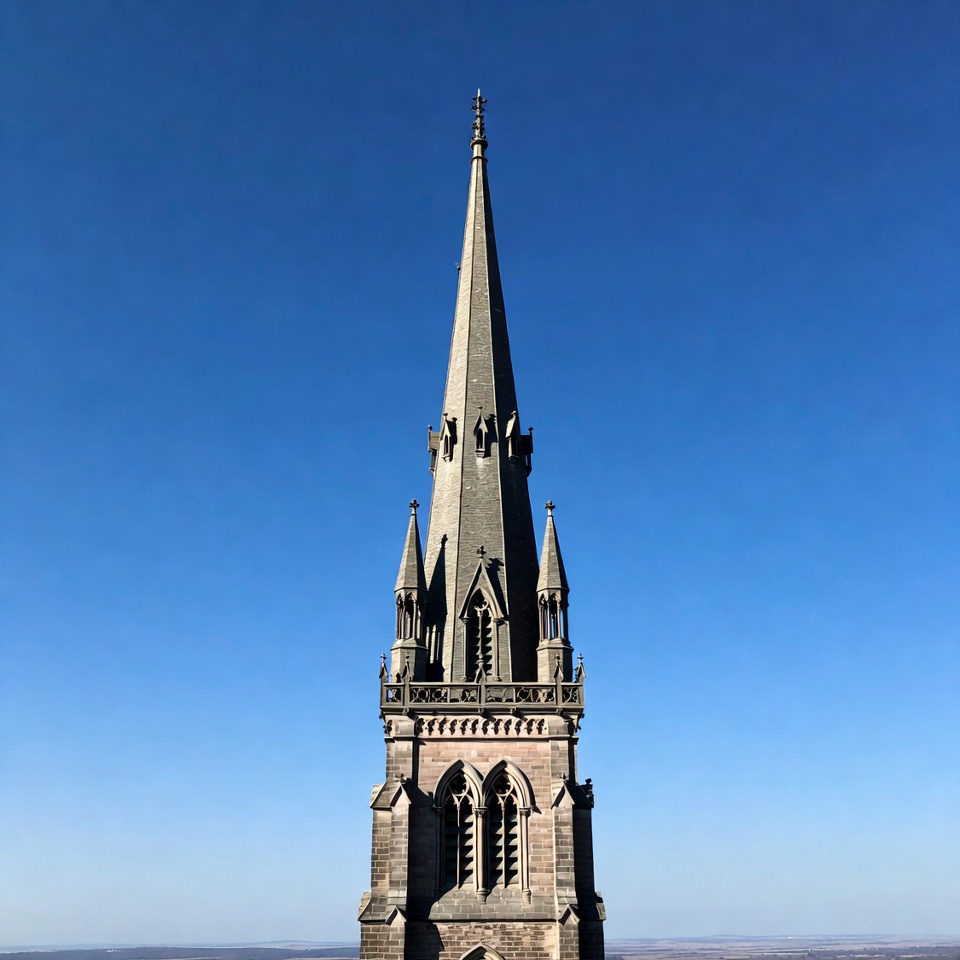 A tall Gothic church steeple rises sharply against a clear blue sky. The stone structure features pointed arches, ornate detailing, and multiple spires. It stands isolated with a distant horizon visible below.