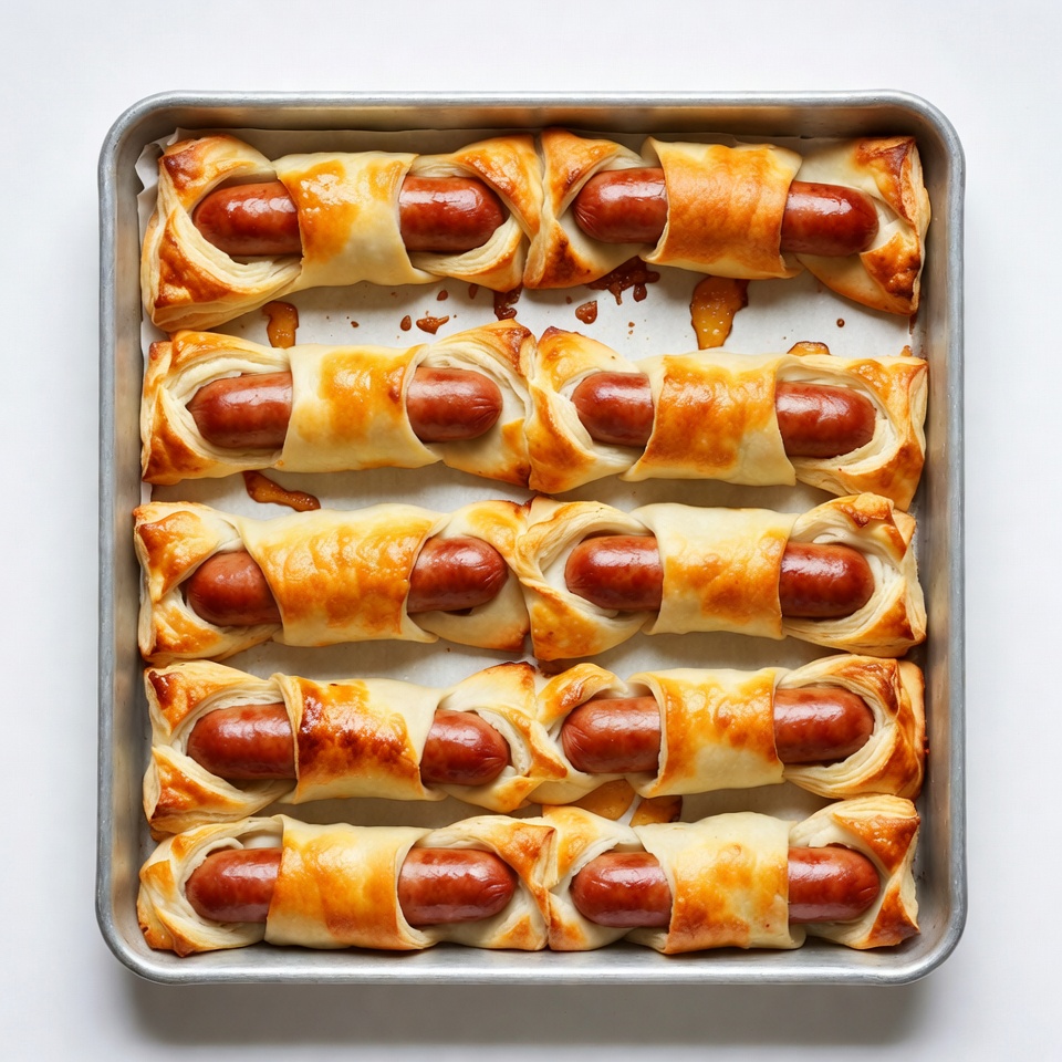 Several pigs in a blanket are arranged in a square metal baking tray. Each sausage is wrapped in golden-brown pastry dough and glazed with shiny sauce. The tray sits on a white surface with some sauce drippings visible.