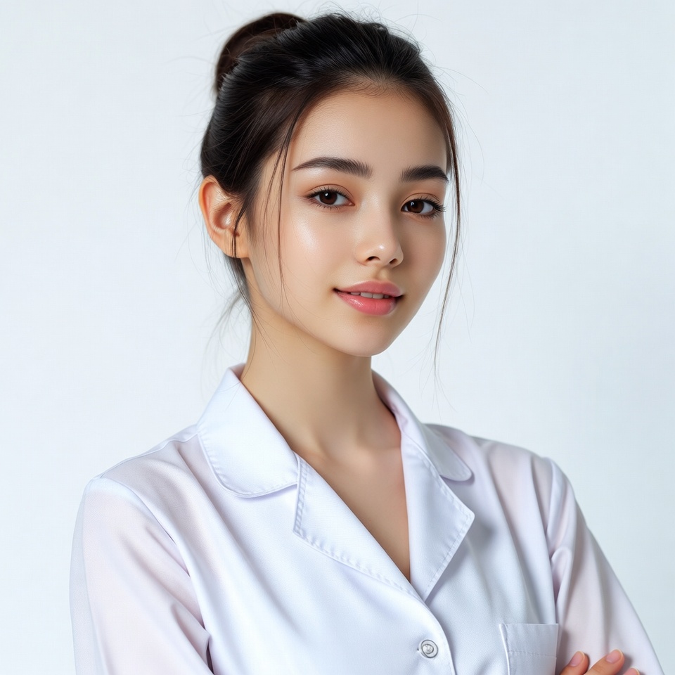 East Asian, arms crossed, beauty, bun hairstyle, collared jacket, confident pose, dark hair, fashion, female, headshot, healthcare worker, isolated background, medical uniform, natural makeup, nurse, portrait, pretty woman, professional, serene expression, smiling, studio photo, white background, white uniform, young woman, Asian woman