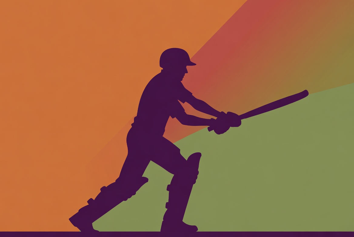 A black silhouette of a male cricketer in batting stance swings a bat against a vibrant gradient background of orange, red, and green. He wears a helmet, pads on legs, and full cricket gear. The illustration is isolated on a colorful backdrop.