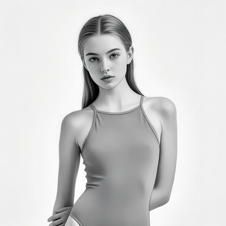 A young woman with long straight hair stands posing against a white background. She wears a sleek gray spaghetti-strap swimsuit that accentuates her slender figure. Her expression is neutral with a slight pout, and the image is rendered in a realistic digital art style.
