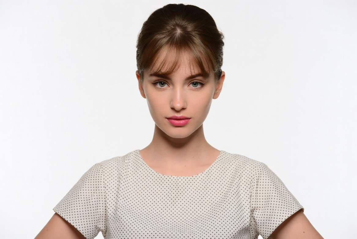 A young woman with straight brown hair styled in a neat bun and straight bangs gazes directly at the camera. She has green eyes, pink lips, and fair skin. She wears a white polka-dot short-sleeve top and stands against a plain white background.