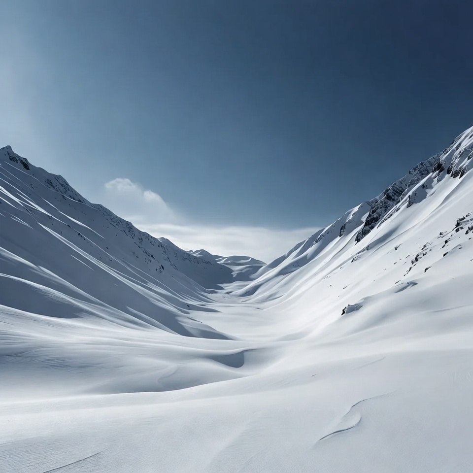 A vast snowy valley stretches between towering snow-covered mountains under a clear blue sky. Gentle clouds float above the rugged peaks, and fresh powder blankets the steep slopes and valley floor. The scene captures the serene expanse of a high-altitude winter landscape.