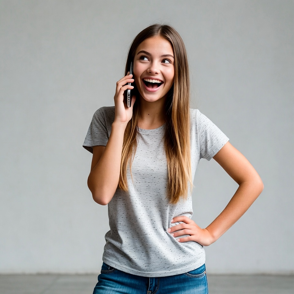 A young woman with long brown hair stands against a plain gray background, laughing joyfully while talking on her smartphone. She wears a gray short-sleeved t-shirt and blue jeans, holding the phone to her ear with one hand on her hip. Her eyes are wide open and her mouth shows a big smile.