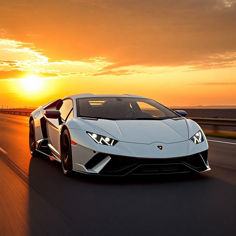 A white Lamborghini Huracan sports car drives on a highway during sunset. The car features sharp angular lines, black accents, and glowing headlights. Orange skies and the setting sun reflect off the vehicle against a blurred road background.