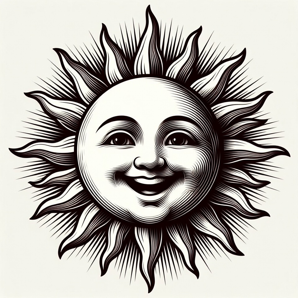 artistic sun, black and white, cartoon sun, cheerful face, clipart, engraving, graphic design, happy sun, illustration, isolated background, line art, radiant sun, rays, smiling sun, sun face, sun illustration, vintage style, sun