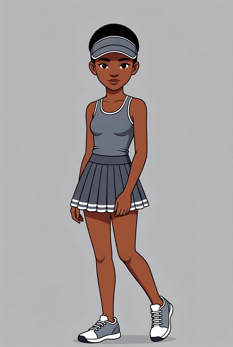 A cartoon illustration of an African-American girl standing on a gray background. She wears a gray tank top, pleated skirt with white trim, visor, and sneakers. She poses confidently with one leg slightly forward.