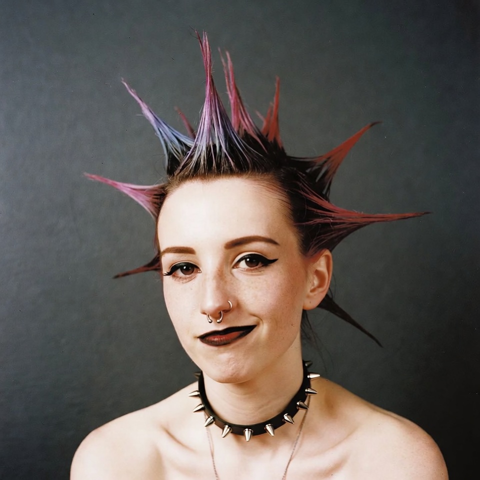 White, blue hair, choker necklace, colorful hair, dark lipstick, edgy hairstyle, eyeliner, female, freckles, mohawk, mohawk hairstyle, pale skin, pink hair, portrait, punk, purple hair, septum piercing, smirking, spikes, studded choker, vibrant mohawk, woman