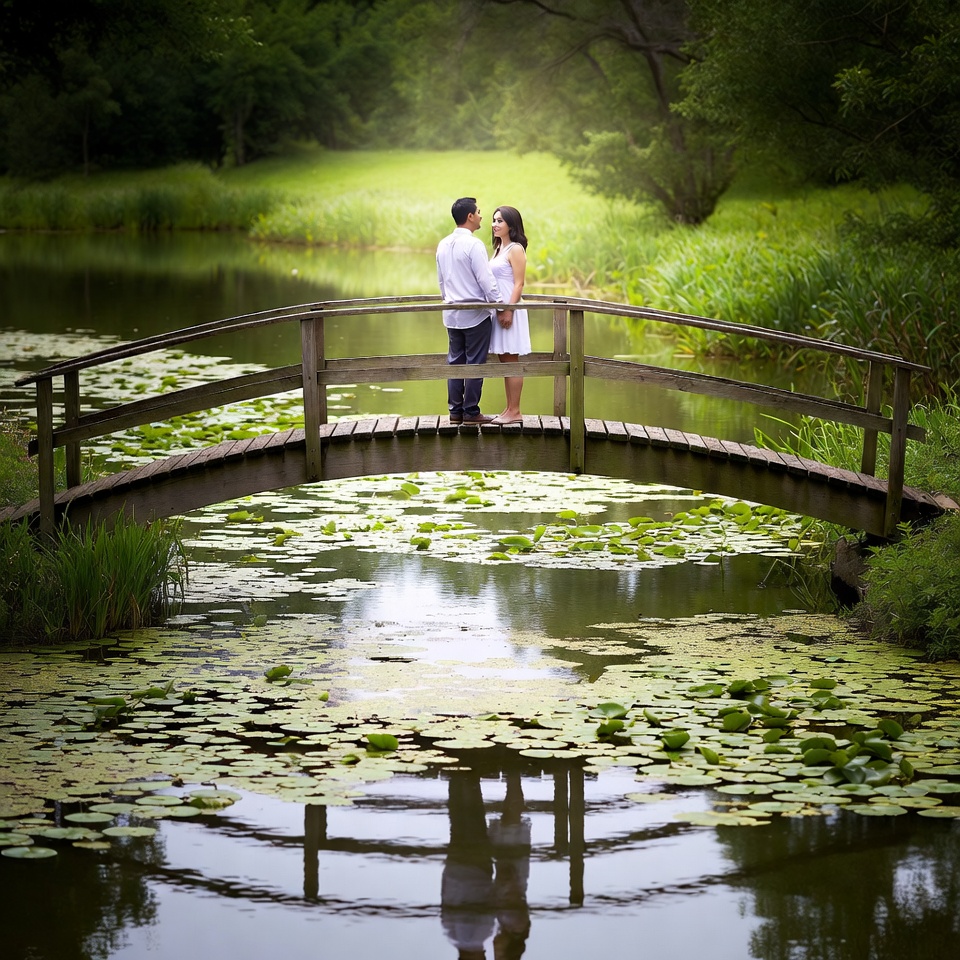 A man and woman stand facing each other on a wooden bridge over a pond covered in lily pads. They are dressed in white clothing, surrounded by lush green foliage and trees. Their reflections are visible in the calm water below.