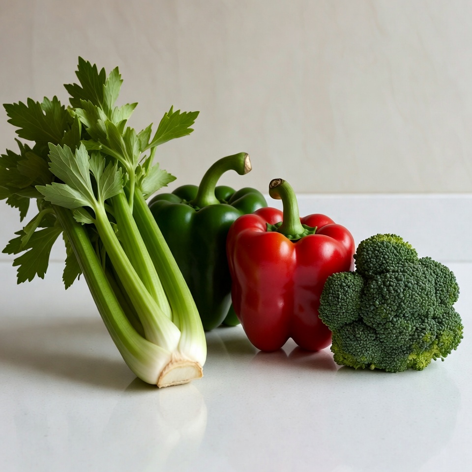 Fresh green celery stalks with leaves stand alongside vibrant green and red bell peppers on a white surface. A cluster of broccoli florets is positioned nearby. All vegetables are arranged against an isolated white background.