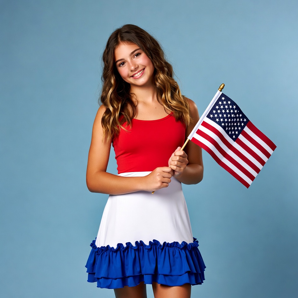 A teenage girl with wavy brown hair smiles while holding a small American flag. She wears a red tank top, white top with blue ruffled skirt in patriotic colors. She stands against a solid blue background.