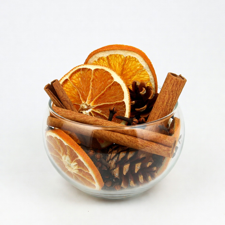 autumn decoration, cinnamon, cinnamon sticks, citrus, clear bowl, craft materials, dried oranges, festive arrangement, glass bowl, holiday decor, home decor, natural elements, orange peel, orange slices, pine cone, pinecones, seasonal scent, spices, winter potpourri, potpourri