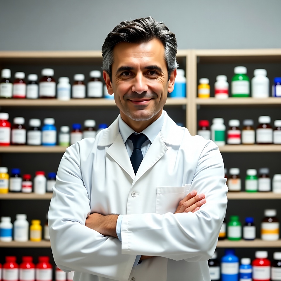 A middle-aged man with short graying hair and a friendly smile stands confidently with arms crossed in front of wooden pharmacy shelves. He wears a white lab coat over a dress shirt and tie. The shelves behind him are stocked with colorful bottles of various medications.