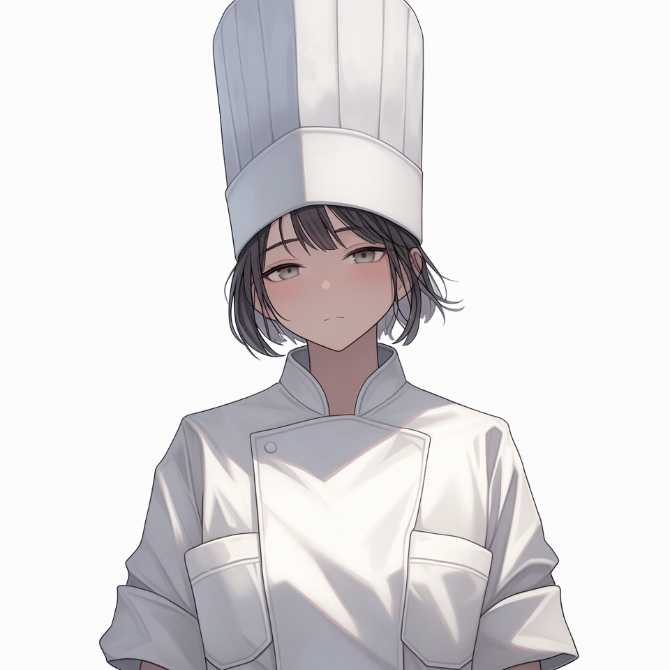 Asian, anime character, chef, chef uniform, cooking, cute chef, dark hair, double-breasted jacket, female, flushed cheeks, illustration, isolated background, kitchen uniform, short hair, tall toque, white chef hat, white jacket, anime girl