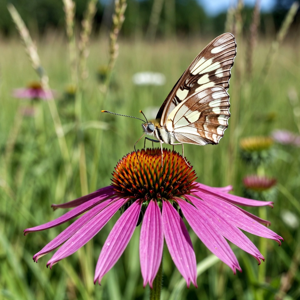 White Admiral, antennae, blue sky, coneflower, field, flowers, grass, insects, isolated background, meadow, nature, orange center, outdoors, pink flower, pollinator, summer, wildlife, wings, butterfly