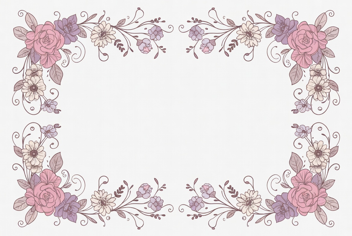 blank center, clipart, daisy flowers, decorative frame, digital art, elegant design, flower border, frame border, hand drawn, illustration, isolated background, pastel colors, pink roses, purple flowers, rose frame, symmetrical frame, vines, watercolor style, white flowers, floral frame