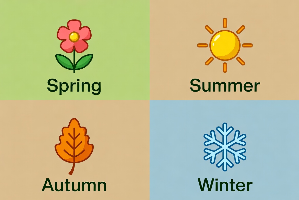 A colorful illustration divided into four quadrants represents the seasons. Spring features a pink flower on a green background, summer shows a bright yellow sun on beige, autumn displays an orange leaf on brown, and winter has a blue snowflake on light blue.