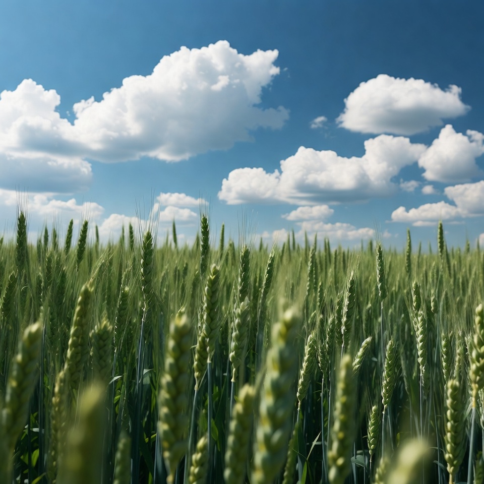 agriculture, blue sky, cereal crop, clear sky, clouds, countryside, crop field, farm field, farmland, field landscape, fluffy clouds, golden wheat, grain crop, grain field, green wheat, harvest time, nature, outdoor, ripe wheat, rural scene, sky, summer field, sunny day, vast field, wheat stalks, wheatgrass, white clouds, wheat field