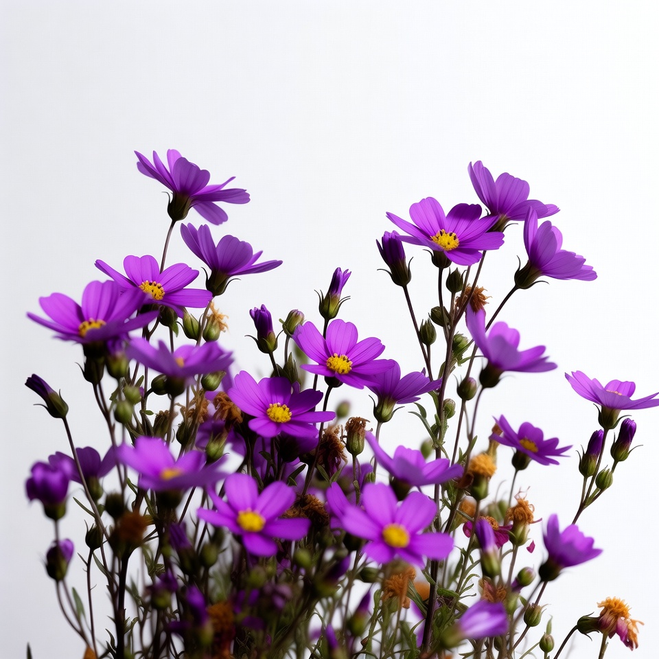 blooming flowers, daisy-like flowers, floral arrangement, flower bouquet, flower buds, flower cluster, garden flowers, green stems, isolated flowers, nature, purple flowers, vibrant purple, white background, yellow centers, cosmos flowers