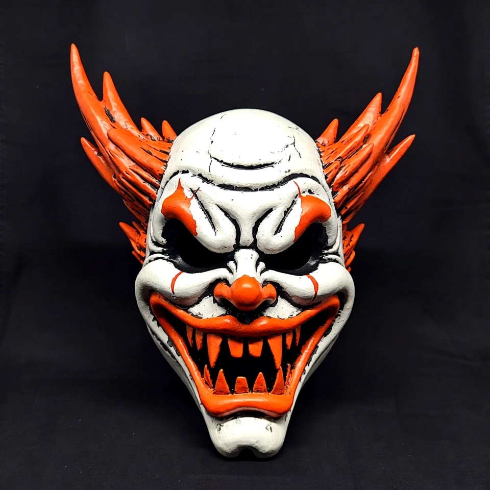 A detailed evil clown mask features a white face with black accents around the eyes and red cheeks. It has sharp orange horns and hair, a large red nose, and a wide grinning mouth with jagged teeth. The mask is centered against a solid black background.