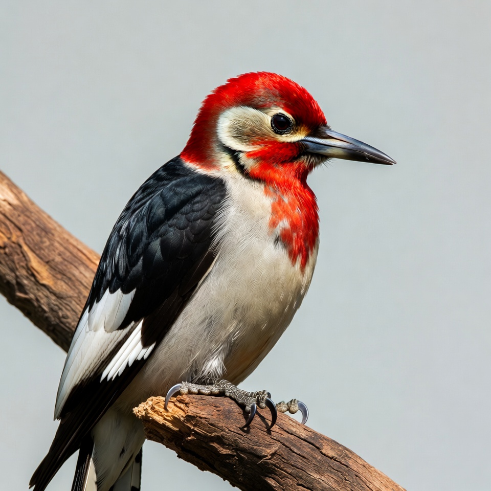 A red-headed woodpecker perches on a wooden branch against a light gray background. The bird features a striking red head, black wings, white underparts, and a long black beak. Its talons grip the rough bark firmly.