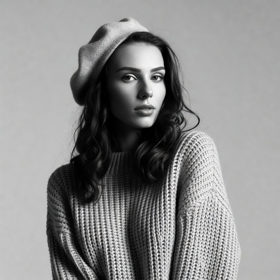 A young woman with long wavy dark hair wears a beret hat and a chunky knit sweater. She gazes directly at the camera with a subtle expression in this black and white portrait. The image features a plain gray background.