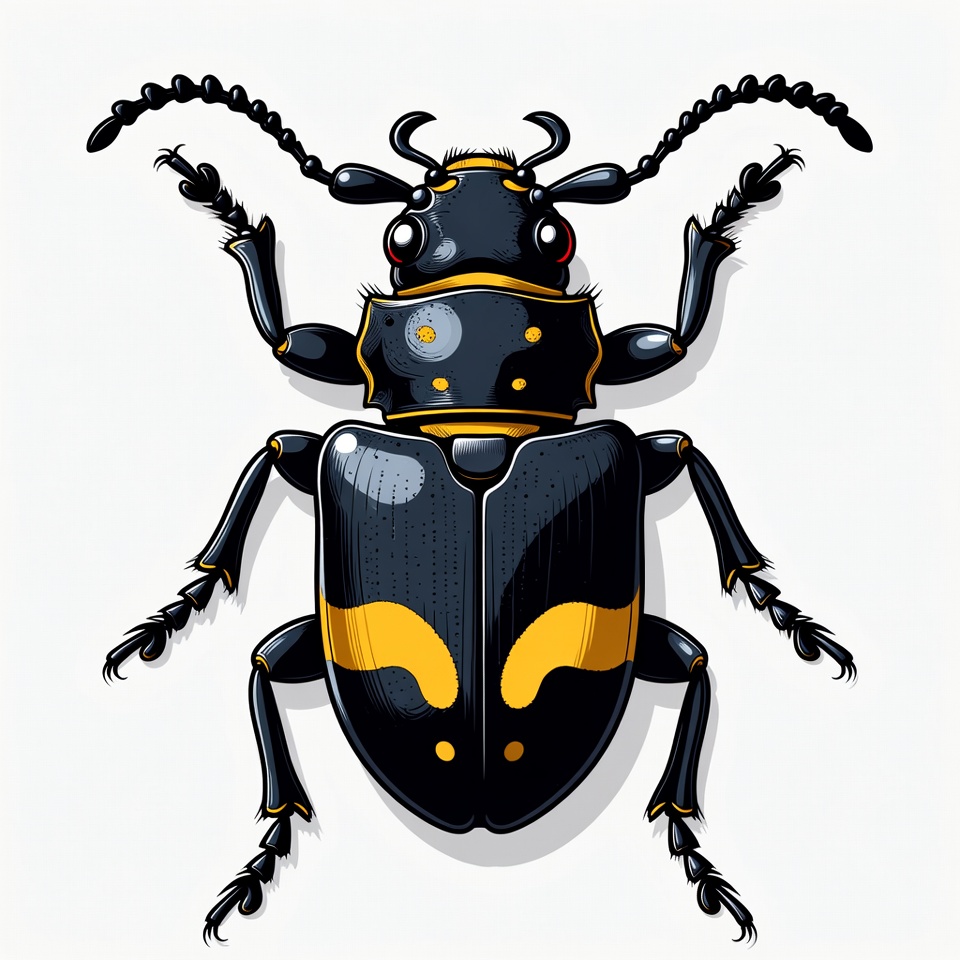 antennae, arthropod, black beetle, bug, clipart, detailed drawing, eyes, graphic, illustration, insect, isolated background, legs, longhorn beetle, nature, shiny body, vector art, wildlife, wings, yellow spots, beetle