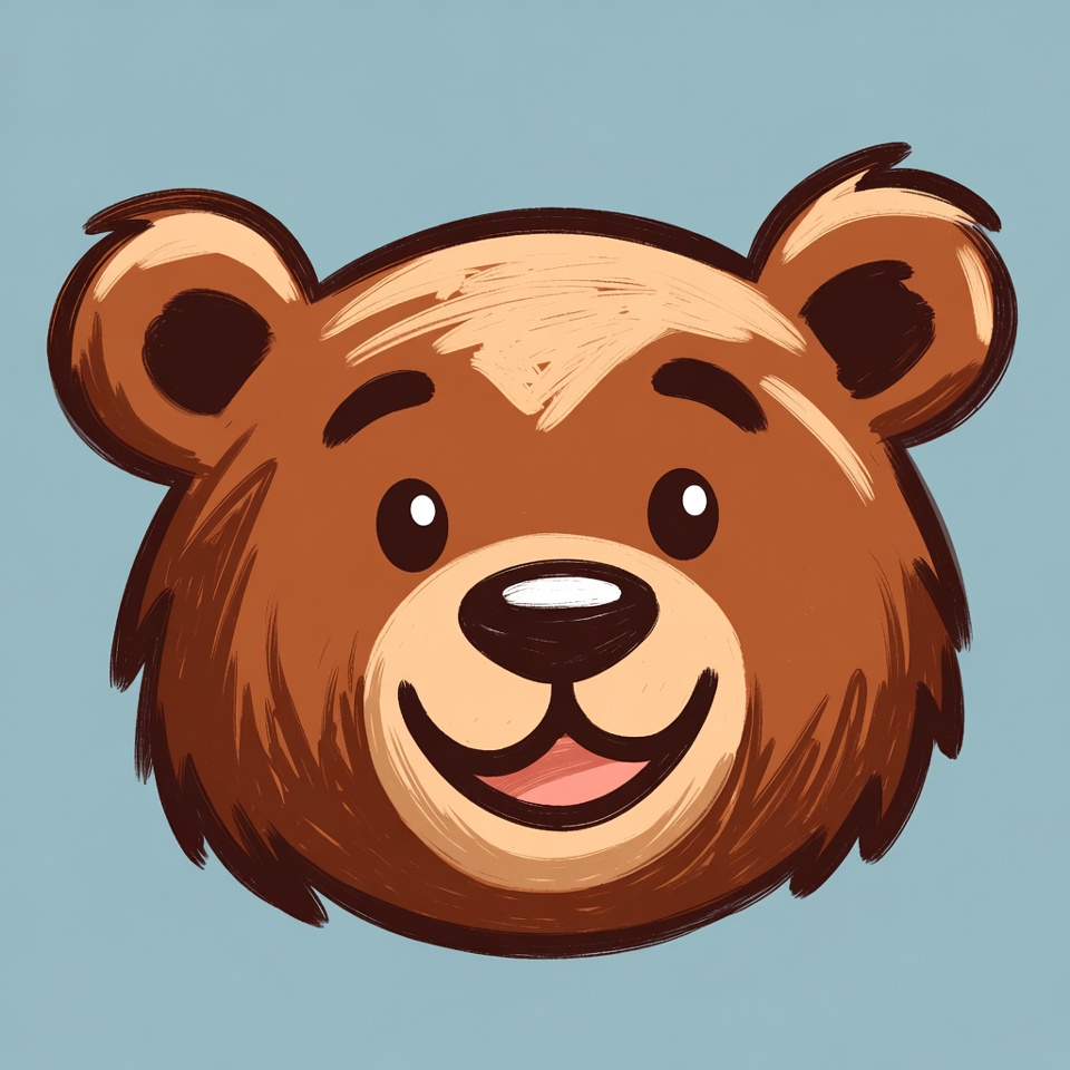 A cheerful cartoon bear with brown fur and big expressive eyes smiles happily. It features a black nose, rosy cheeks, and fluffy outlined fur. The illustration is set against a solid light blue background.