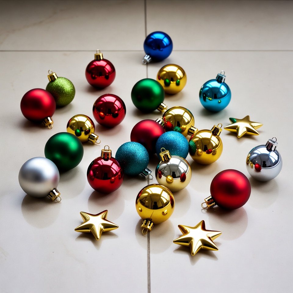 A collection of shiny Christmas baubles in red, green, blue, gold, silver, and other colors is scattered across a tiled floor. Golden star ornaments are placed among the round balls. The ornaments reflect light on the white and gray tiles.