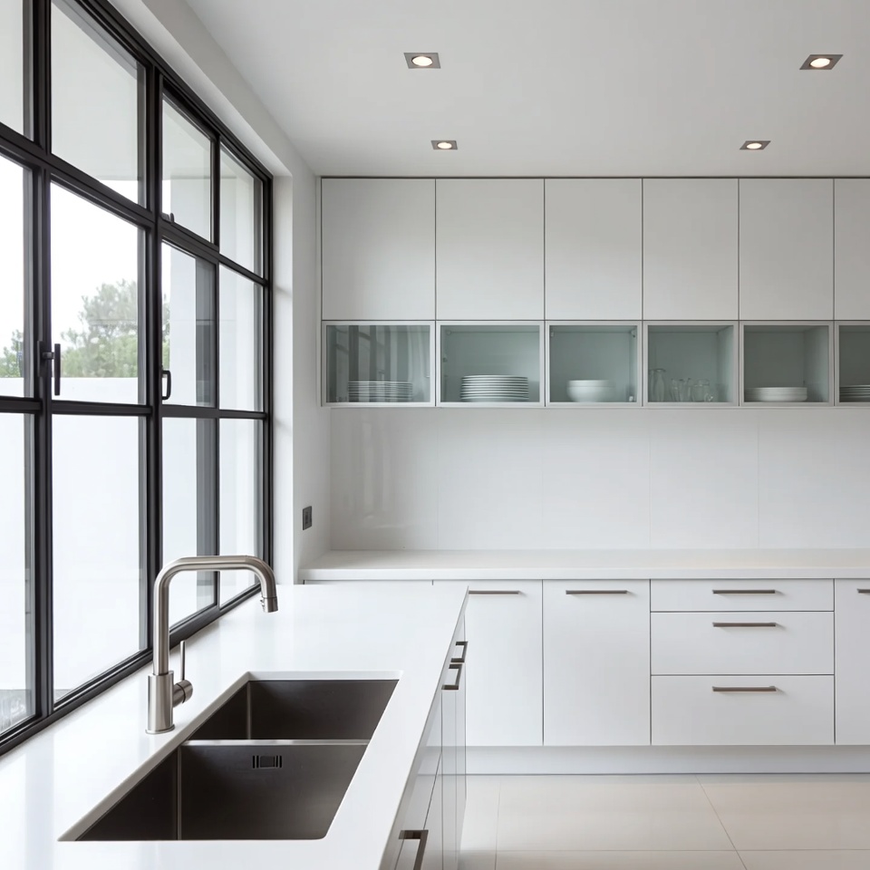 A sleek modern kitchen features glossy white cabinets and a large stainless steel sink. Black-framed windows allow natural light to flood the space, with glass-fronted upper cabinets displaying white plates. The countertop extends seamlessly with integrated handles on the drawers.