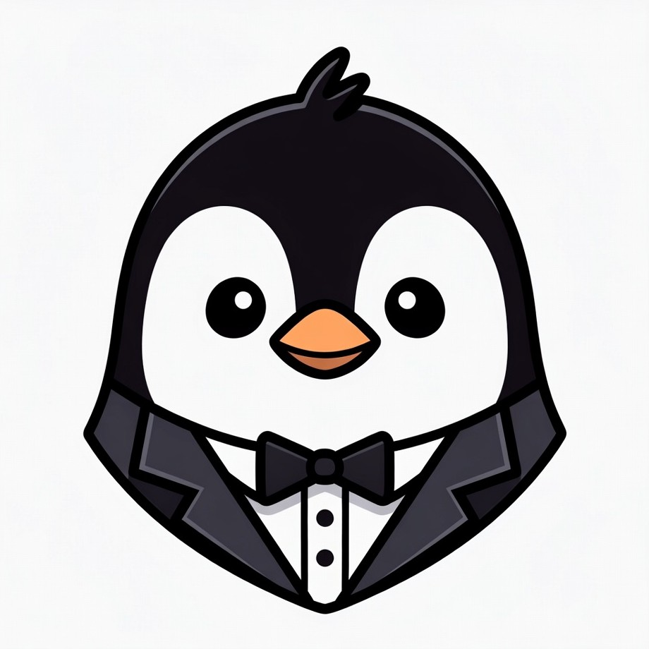 A cute cartoon penguin with black and white feathers wears a formal black tuxedo and bow tie. It has large expressive eyes and an orange beak, set against a white isolated background. The illustration features a friendly, dapper appearance.