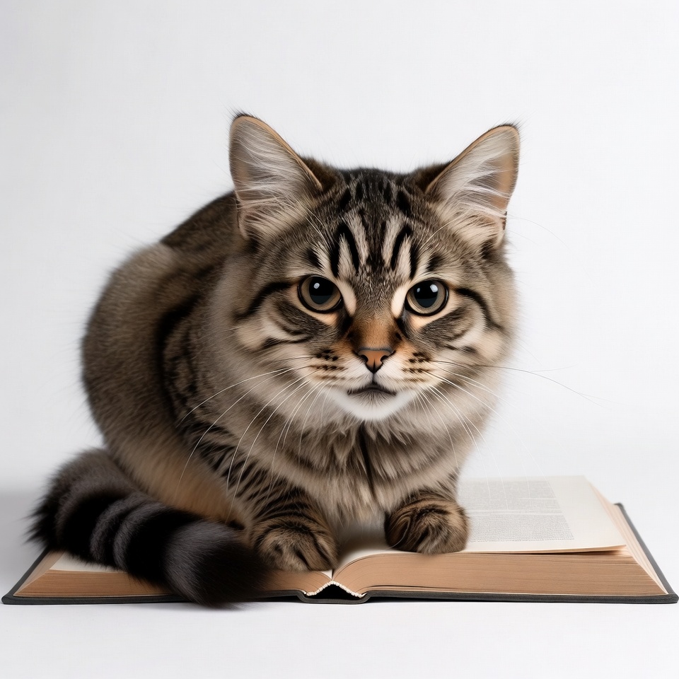 animal, book reading cat, brown cat, curious cat, cute cat, feline, green eyes, isolated background, kitten, open book, paws on book, pet, reading book, striped cat, tabby cat, white background, cat