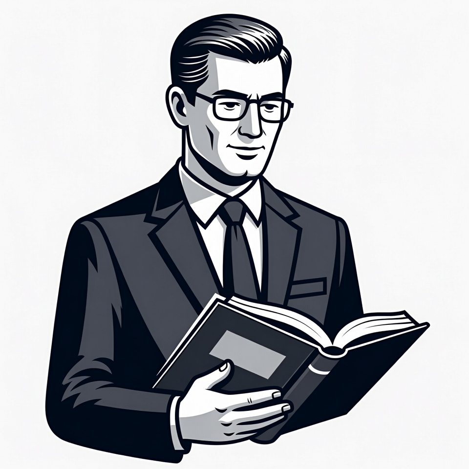 A black and white illustration depicts a man with short hair and glasses wearing a suit and tie. He holds an open book with both hands, reading attentively. The image features clean line art on a white isolated background.