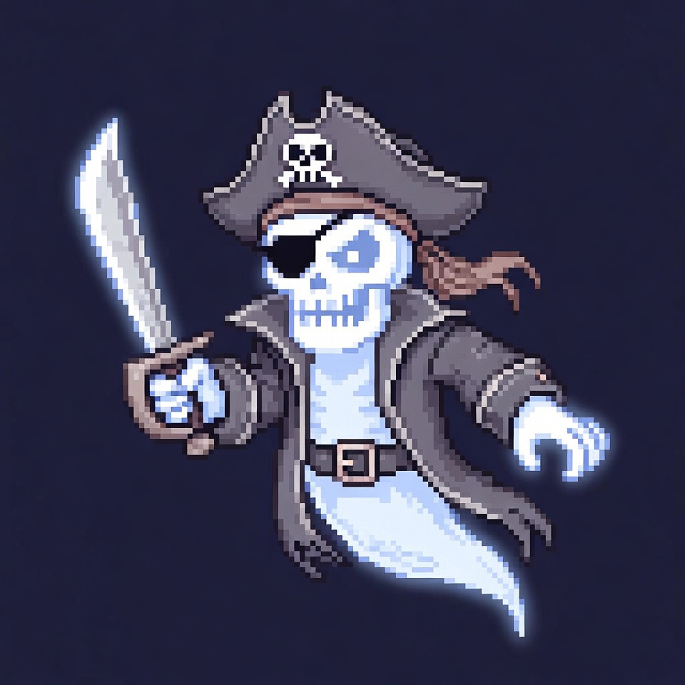 bony hand, cartoon ghost, clipart, dark background, ghost pirate, glowing sword, illustration, isolated background, pirate coat, pirate hat, pixel art, skeleton pirate, skull crossbones, sword, tricorn hat, undead pirate, pirate ghost