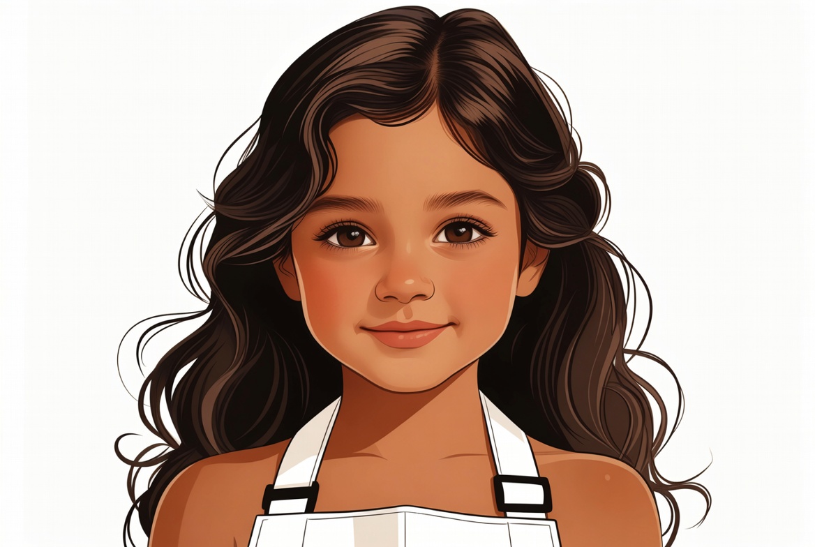 A young girl with long wavy brown hair and warm brown eyes smiles at the viewer. She wears a white apron with shoulder straps over her clothing. The illustration is on an isolated white background.
