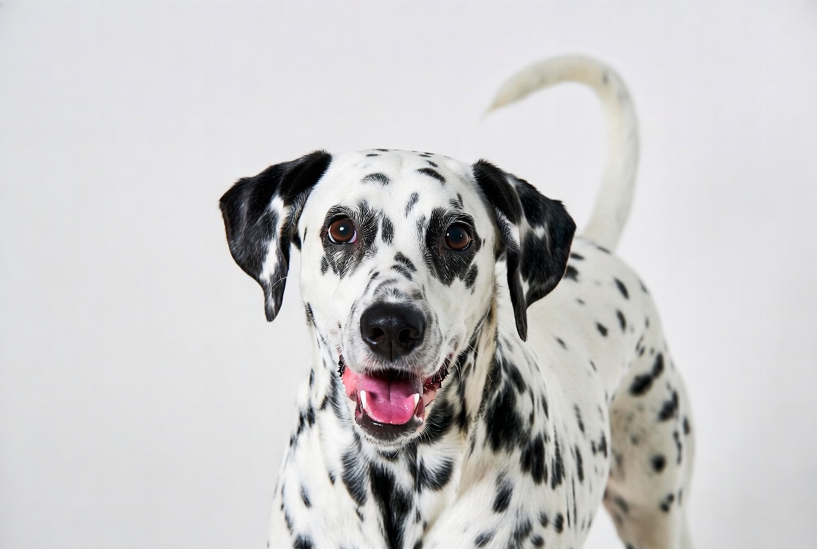 A Dalmatian dog with black spots on white fur stands on a plain white background. It faces forward with its tongue out in a happy expression and tail curved upward. The dog's spotted coat and alert ears are prominently visible.