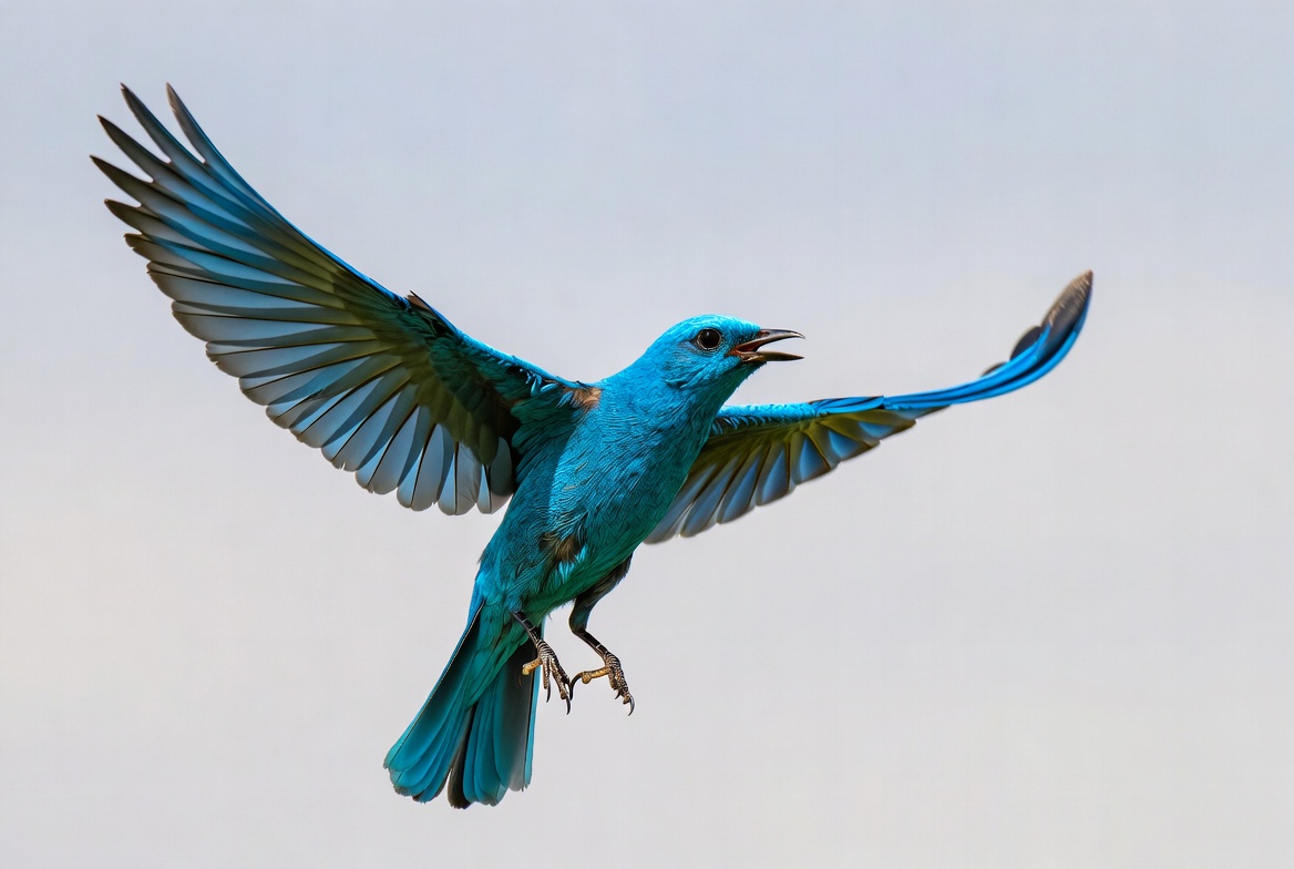 A vibrant blue grosbeak bird soars through the air with its wings fully extended. Its feathers display shades of bright blue and indigo, with a small orange beak open as if calling. The bird is captured mid-flight against a plain sky background.