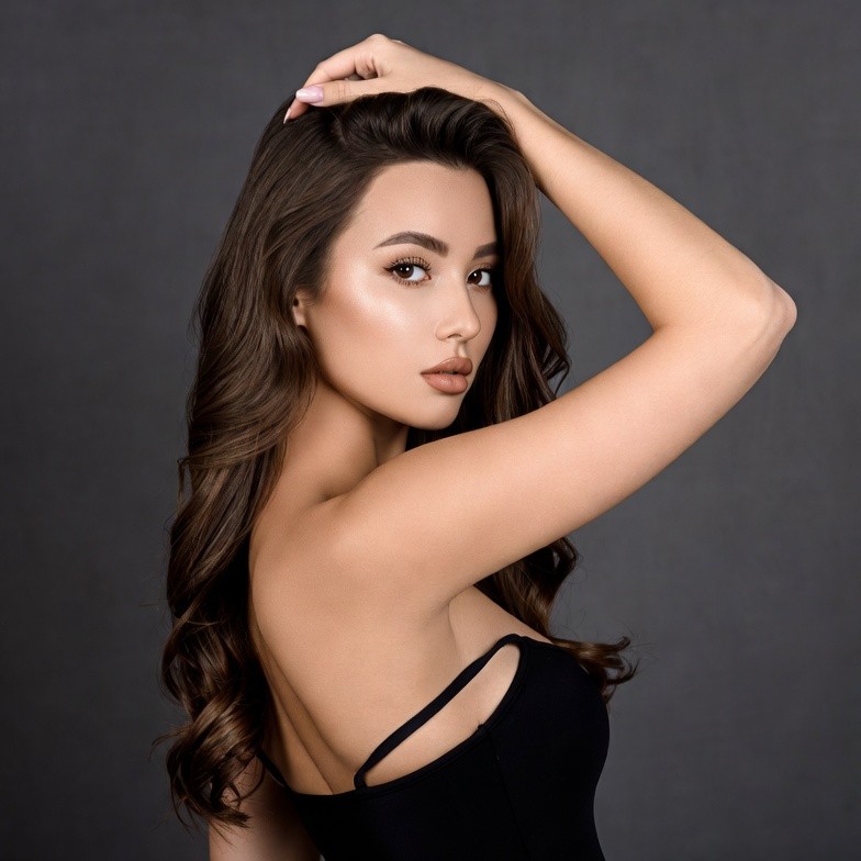 A young Asian woman with long wavy brown hair poses from behind with her hand touching her head. She wears a black sleeveless top that reveals her shoulders and has subtle makeup with glossy lips. The image features a plain gray background.