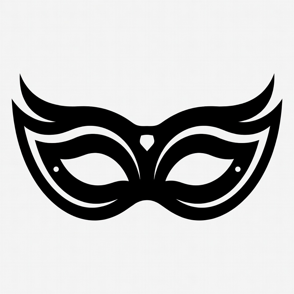 A black silhouette illustration of an ornate masquerade mask covers the eye area. It features elaborate curved wings, eye holes, and a central gem detail. The mask is centered on a plain white background.