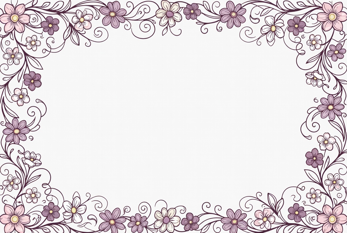 border graphic, clipart, decorative frame, empty center, floral border, floral pattern, frame design, hand drawn, illustration, isolated background, line art, ornament, pastel colors, pink flowers, purple flowers, rectangular border, swirl design, vines, white flowers, flower frame