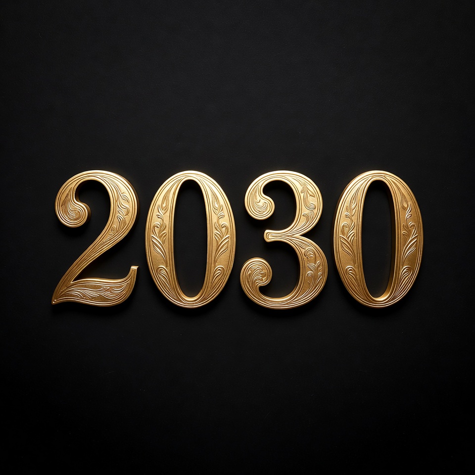 Elegant gold numbers '2030' with ornate filigree designs stand out against a solid black background. The metallic lettering features intricate curls and decorative patterns on each digit. The design has a luxurious, 3D embossed appearance.
