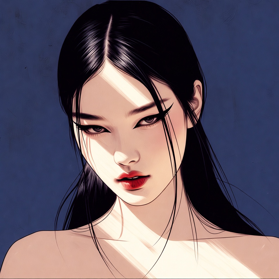 A beautiful Asian woman with straight long black hair gazes forward with striking makeup. She has sharp eyeliner, red lips, and soft lighting highlighting her face against a dark blue background. The digital illustration emphasizes her elegant features and smooth skin.