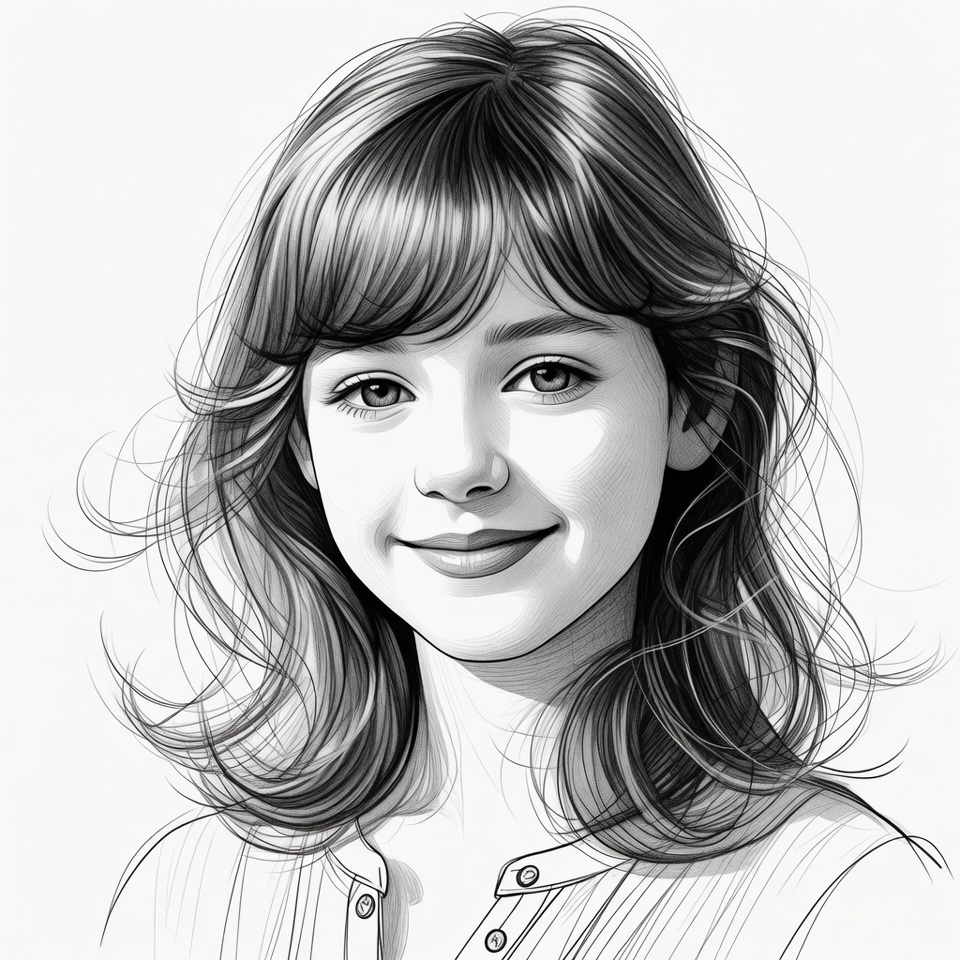 A detailed pencil sketch portrait features a young woman with long wavy brown hair and bangs. She has large expressive eyes and a gentle smile on her face. She wears a collared shirt, rendered in black and white with soft shading on an isolated background.