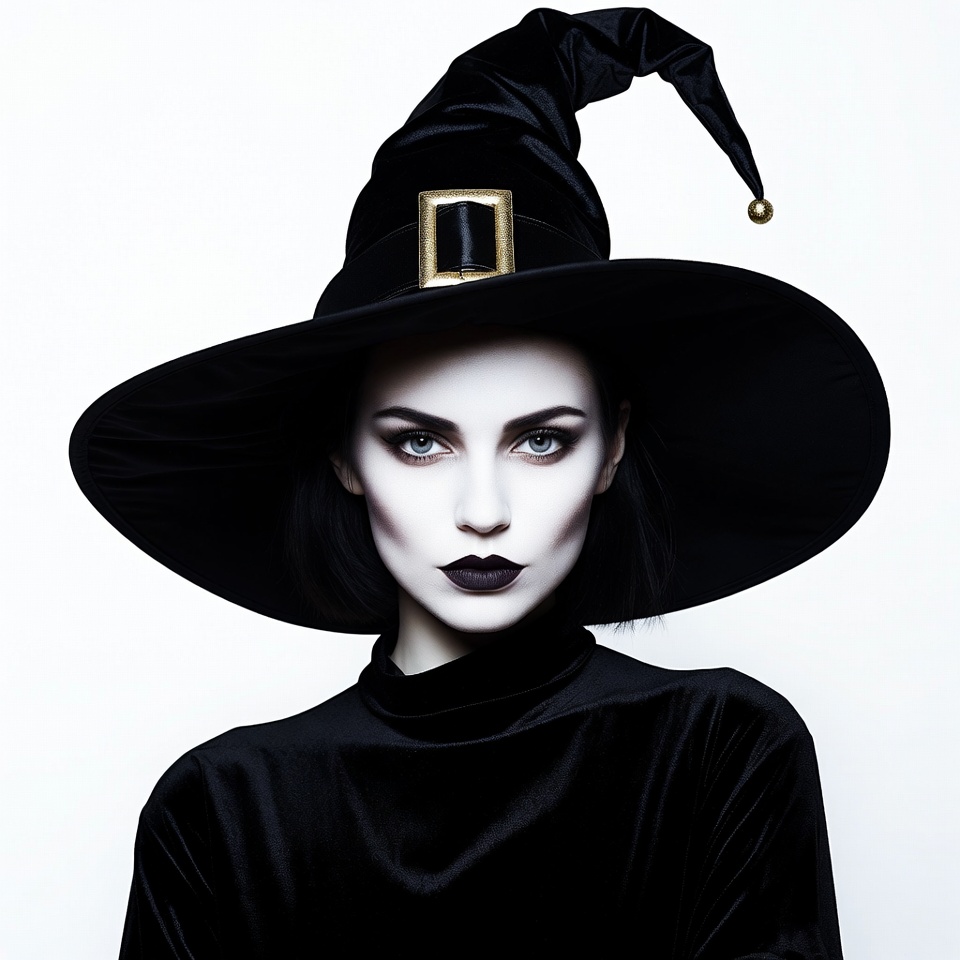 A woman with pale makeup and dark lipstick wears a large black witch hat with a gold buckle and stands against a white background. She has straight black hair framing her face and intense green eyes. She is dressed in a black velvet high-neck top.