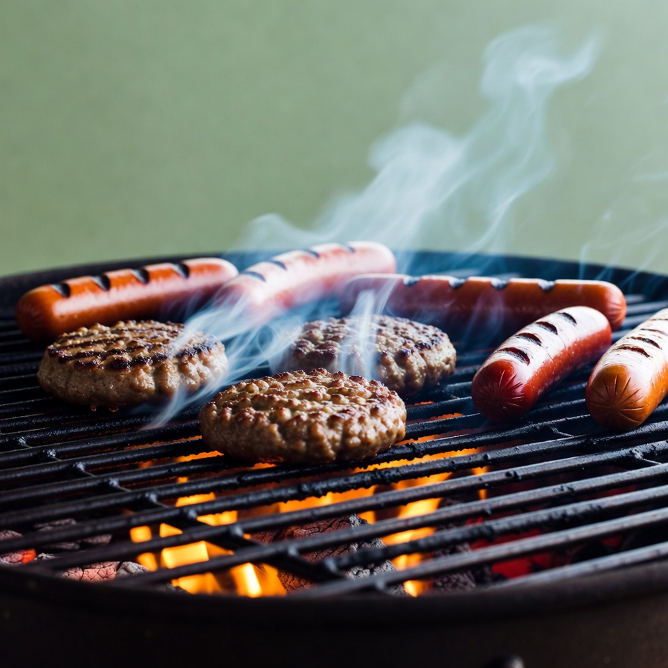 bbq, burgers, closeup, flames, food photography, green background, grill marks, grilled food, grilling, hot dogs, juicy burgers, meat, outdoor cooking, sausages, sizzling meat, smoke, barbecue grill