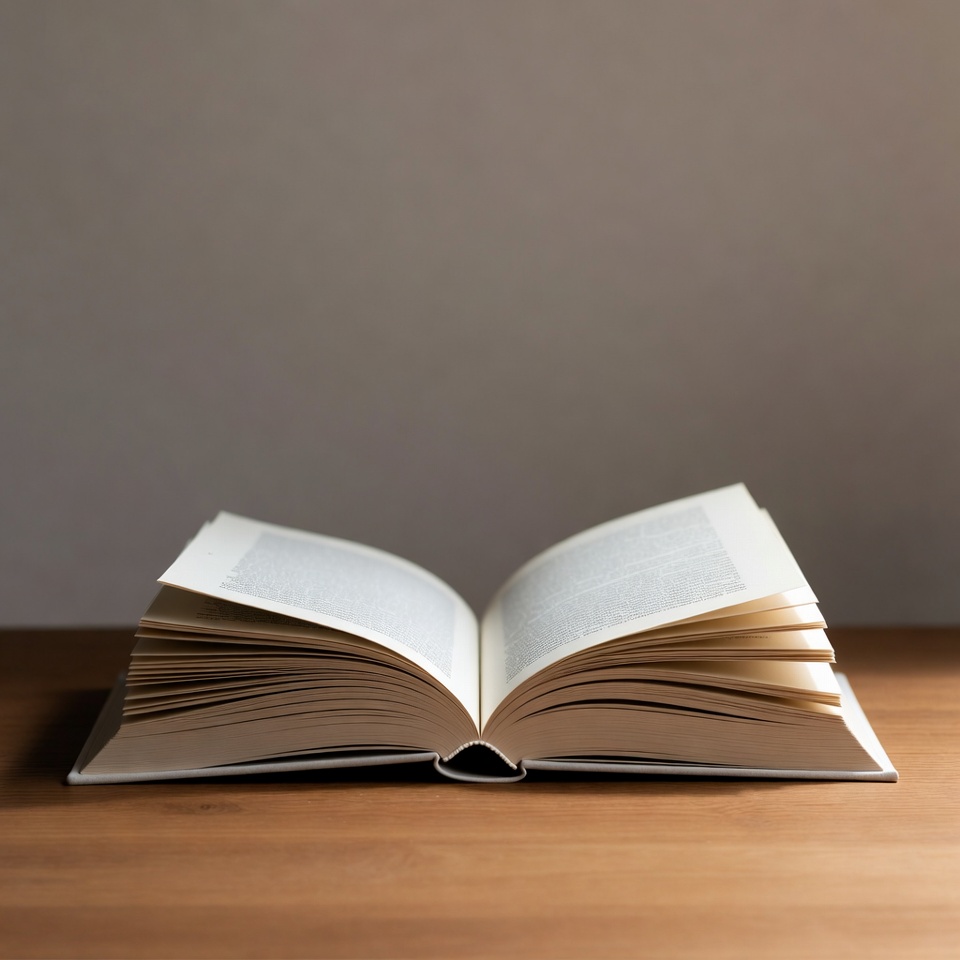 An open book with white pages lies flat on a wooden table. The book is positioned with both covers spread wide, revealing dense text on the inner pages. A soft gray background provides a clean, isolated setting.